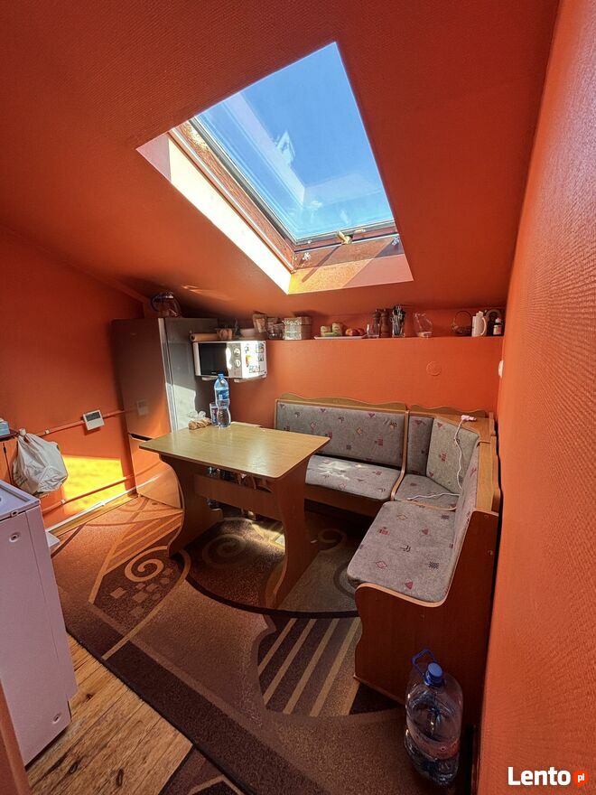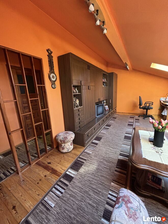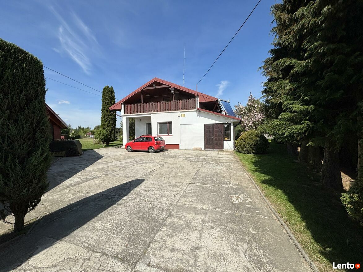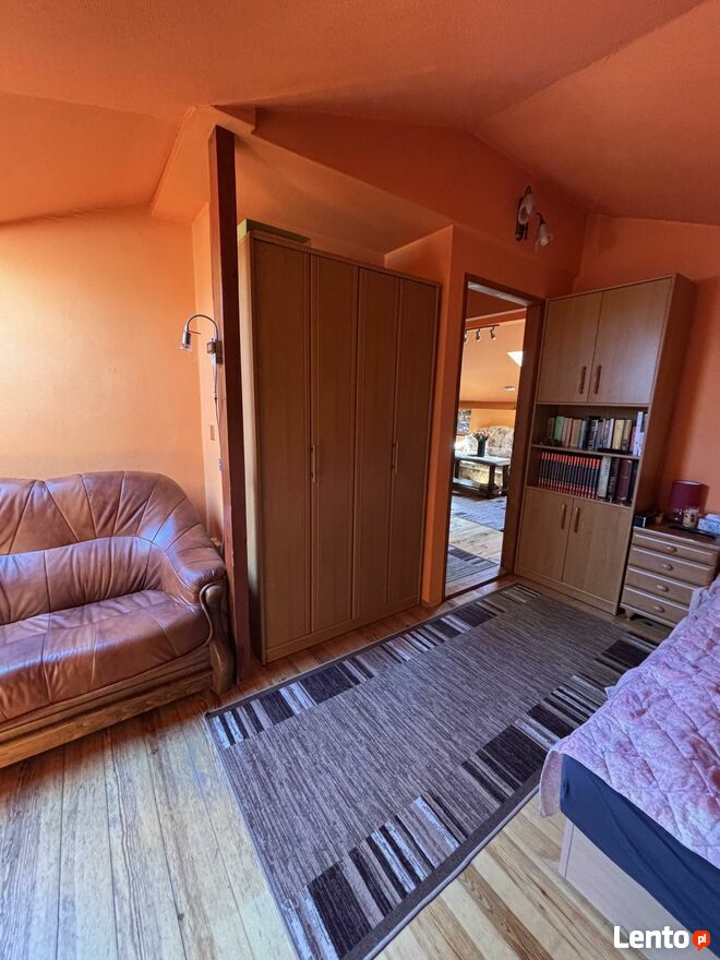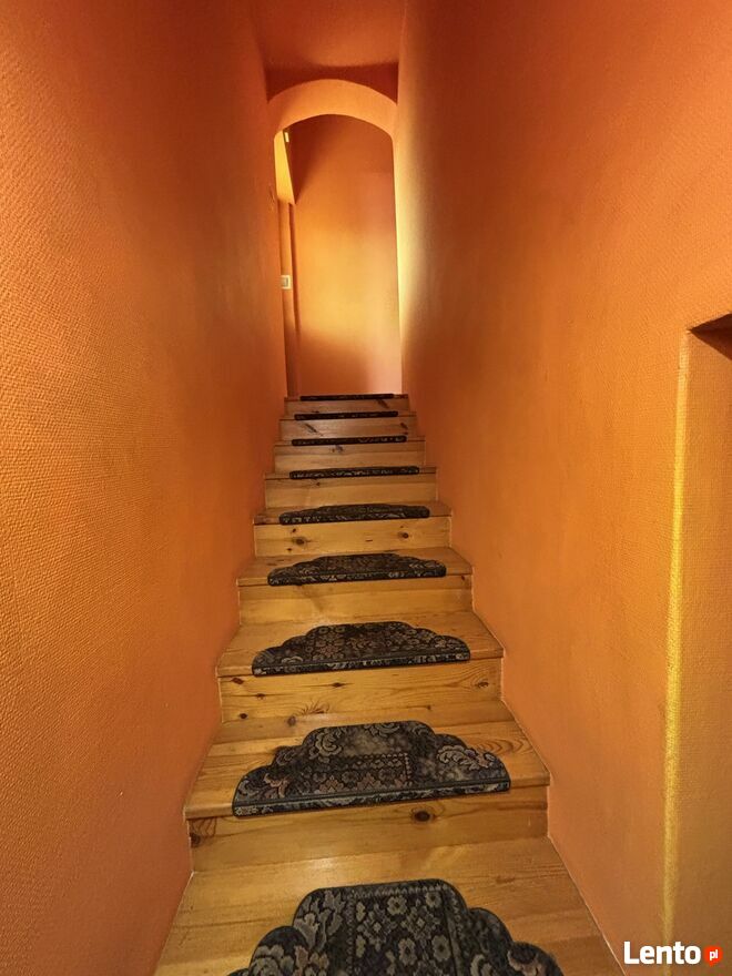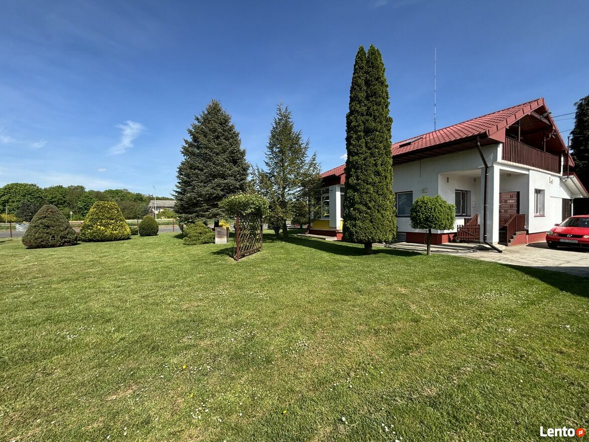 - podpiwniczony dom o łącznej powierzchni użytkowej 280 m2 z poddaszem użytkowym. Piwnica składa się z trzech pomieszczeń gospodarczych, pralni oraz kotłowni wyposażonej w piec węglowy i gazowy. Parter zaadaptowany na restaurację wraz zapleczem kuchennym - możliwość bezproblemowej przebudowany na część mieszkalną. Poddasze składające się z 3 pokoi, kuchni, łazienki, korytarza oraz zadaszonego tarasu wypoczynkowego wykończonego naturalnym drewnem o powierzchni 20 m2.