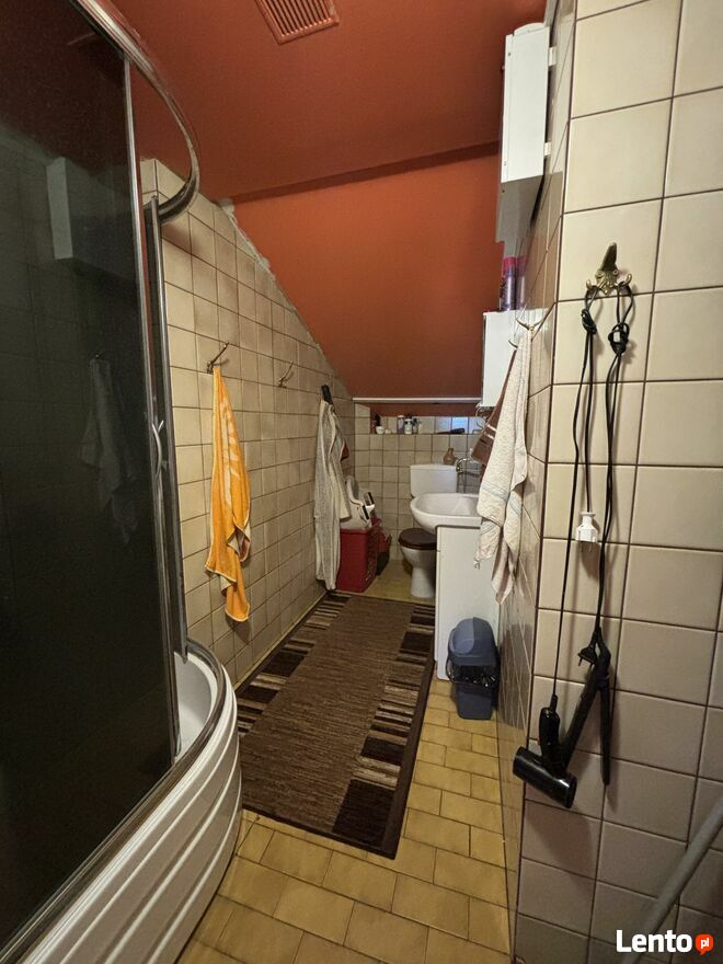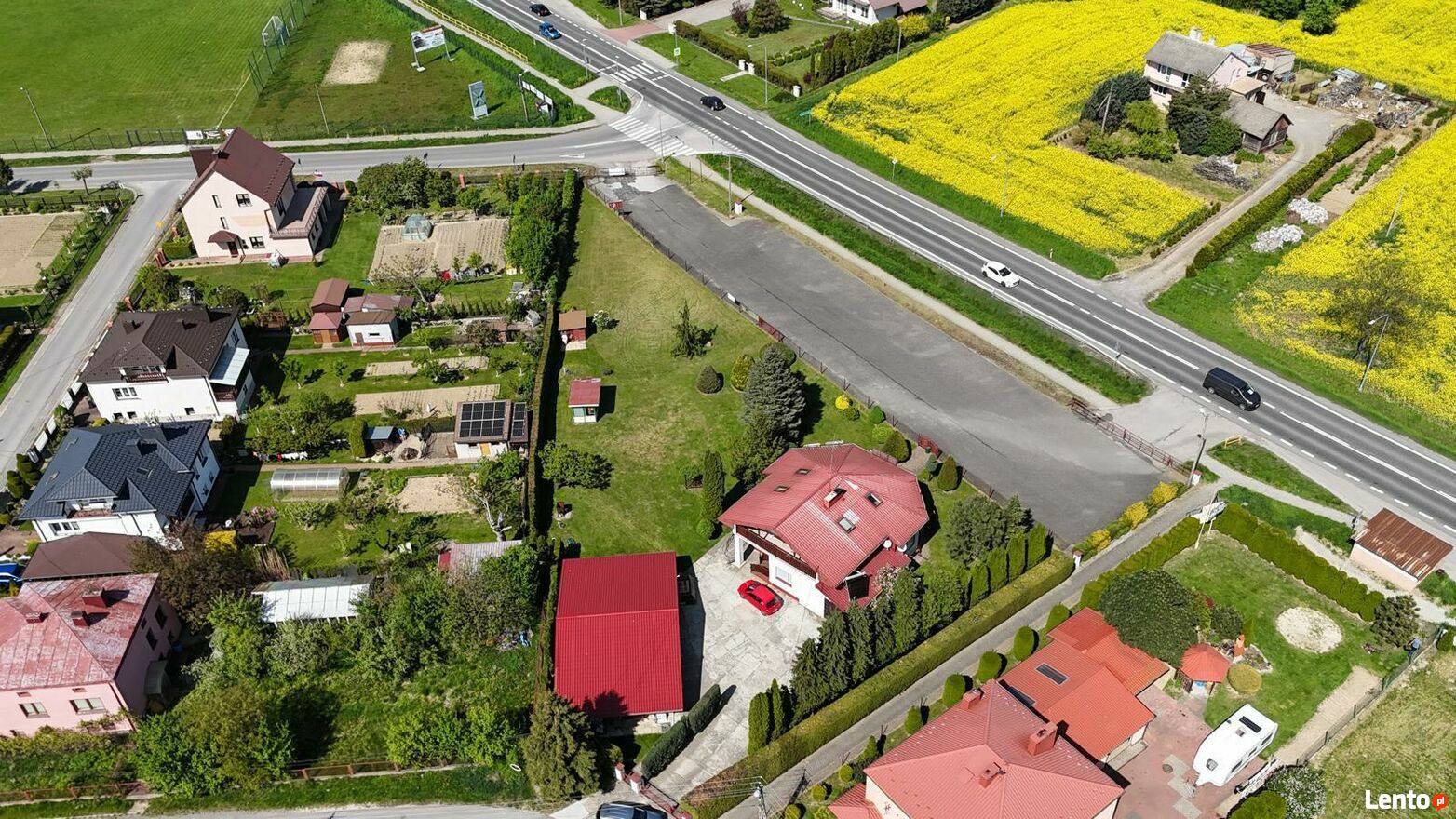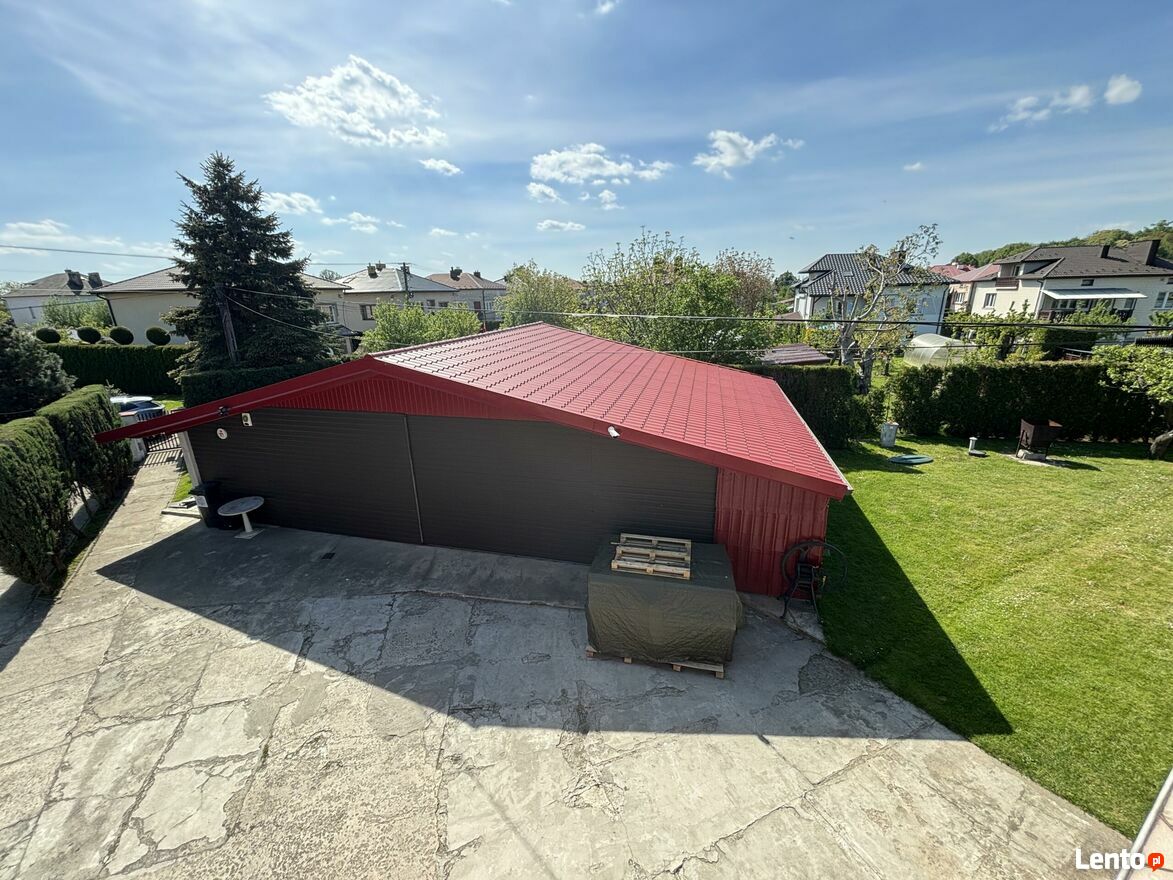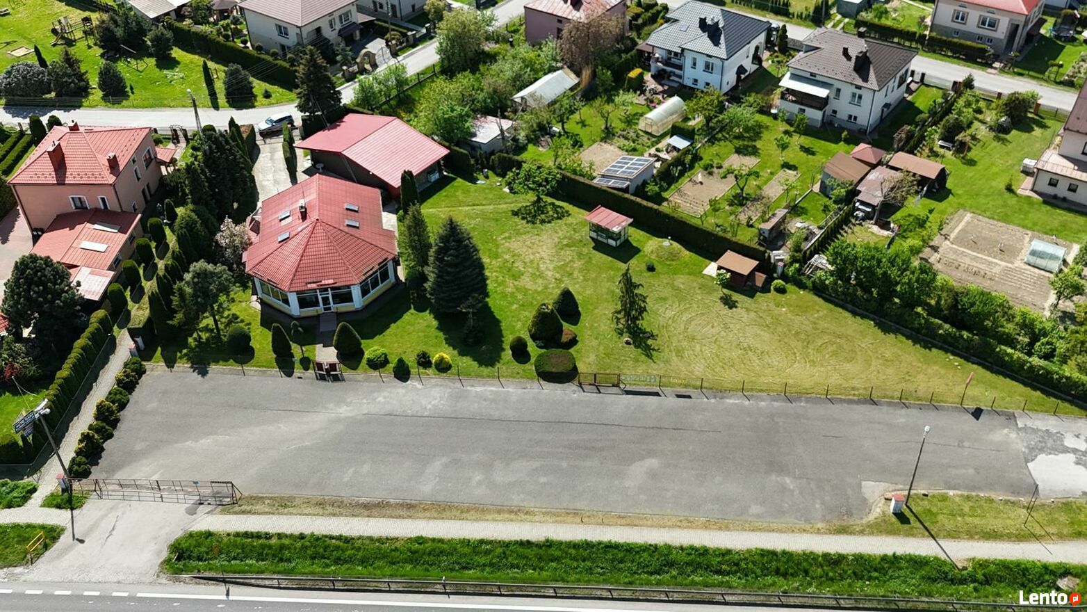 - podpiwniczony dom o łącznej powierzchni użytkowej 280 m2 z poddaszem użytkowym. Piwnica składa się z trzech pomieszczeń gospodarczych, pralni oraz kotłowni wyposażonej w piec węglowy i gazowy. Parter zaadaptowany na restaurację wraz zapleczem kuchennym - możliwość bezproblemowej przebudowany na część mieszkalną. Poddasze składające się z 3 pokoi, kuchni, łazienki, korytarza oraz zadaszonego tarasu wypoczynkowego wykończonego naturalnym drewnem o powierzchni 20 m2.